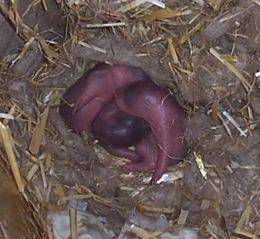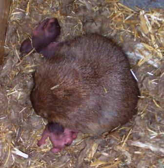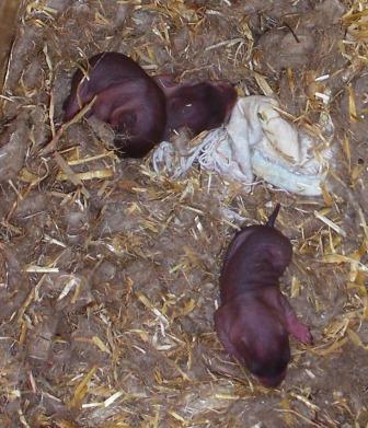Am 29. September ließ Bonnie wieder seinen Paarungsruf verkünden. Wir konnten es kaum glauben, schließlich hatten Dawn und Bonnie doch erst im Januar 4 süße Babies zur Welt gebracht. Wie konnte es also sein, dass er sich gerade mal 8 Monate später wieder gepaart hat und mit wem? Bisher hieß es doch stets in allen Büchern, Präriehunde würden nur einmal im Jahr Junge bekommen und hinzu wäre es in der Heimtierhaltung extrem selten überhaupt Nachwuchs zu bekommen. Doch es war ja erstmal nur der Paarungsruf... Bloß weil er sich mit einem (oder gar beiden?) Weibchen gepaart hat, heißt das ja noch lange nicht das es auch wirklich wieder Junge gibt. In der ersten Woche war kaum etwas zu merken, aber zur Sicherheit haben wir den Tieren wieder eine große Auswahl an an Futter wie Obst, Gemüse, JR-Farm Powerfutter, Sonnenblumenkerne, Kokosflocken, Erbsenflocken und vielem mehr gegeben. In der darauf folgenden Woche wurden beide Damen sehr aktiv im Nestbau und bekamen kleine Bäuche. Daher nahmen wir uns vor die Tiere am Wochenende zu trennen, doch leider kam es bereits Freitags zu einem heftigen Streit zwischen den beiden Weibchen. Dawn hatte Maxi (die fast doppelt so groß ist) in eine Ecke gedrängt und mit Streu überhäuft. Sie ließ sich noch nicht einmal von mir ablenken, als ich dazwischen ging und Maxi ausgrub. Beide hatten am Ende einige Bissverletzungen. Dawn ließ ich bei Bonnie im Gehege und Maxi nahm ich wie schon im Januar raus. Maxi ist nicht ganz einfach, daher kann ich sie nicht zu den Nachzuchten setzen, die eh sehr Sanftmütig sind und nicht mit den rauen Sitten der Wildfänge klar kommen. In der dritten Woche zeigte sich, dass Maxi nicht trächtig ist, Dawn dagegen umso mehr... Dawns Zitzen wurden deutlich Sichtbar und der Appetit nahm auch stetig zu. Bei dem Bäuchlein, gingen wir schon von 6-10 Jungtieren aus. Am 03. November konnte man aus dem Tierzimmer wieder das Quietschen von PD-Babies hören. 3 gesunde Jungtiere kuschelten sich an den warmen Bauch von Dawn. Die 3 sind im Verhältnis zu dem Nachwuchs vom Januar ein ganzes Stück größer. Allerdings gebärte sie die Drei auch erst nach 35 Tagen. Der 1. Tag: Dieses Mal setzte schon am 1. Tag die Pigmentierung ein.